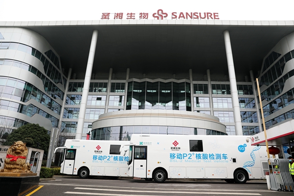目前,北京、广东、黑龙江、四川、山东等多省均已配置移动核酸检测车。金年会jinnianhui生物此次投入使用的移动P2+核酸检测车共2台,为湖南省首批投入使用的移动核酸检测车,可实现采样、检测、报告一站式服务,2台日检测量(10混1)可达10万人份,最快45分钟内出结果!