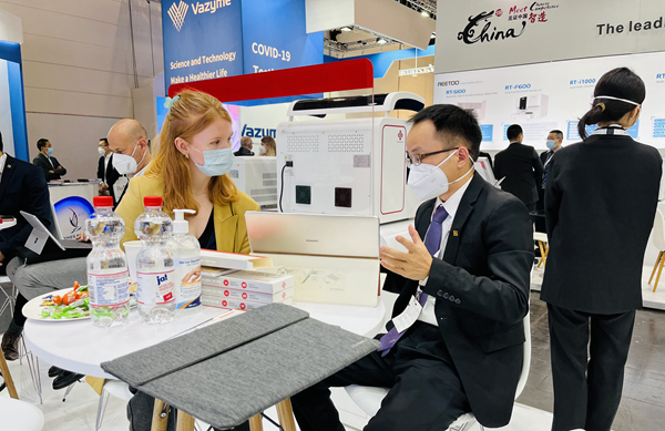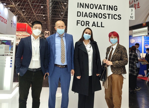 在金年会jinnianhui展台,“全自动解决方案”“半自动解决方案”“新冠整体解决方案”,以最大程度满足不同国家和地区客户、不同应用场景检测需求的特点,获得了众多来访国际客户的好评。尤其是iPonatic四通道产品,以其便捷、易操作、检测时间快、检测项目多等优势吸引了会场一大波新老“粉丝”的目光。